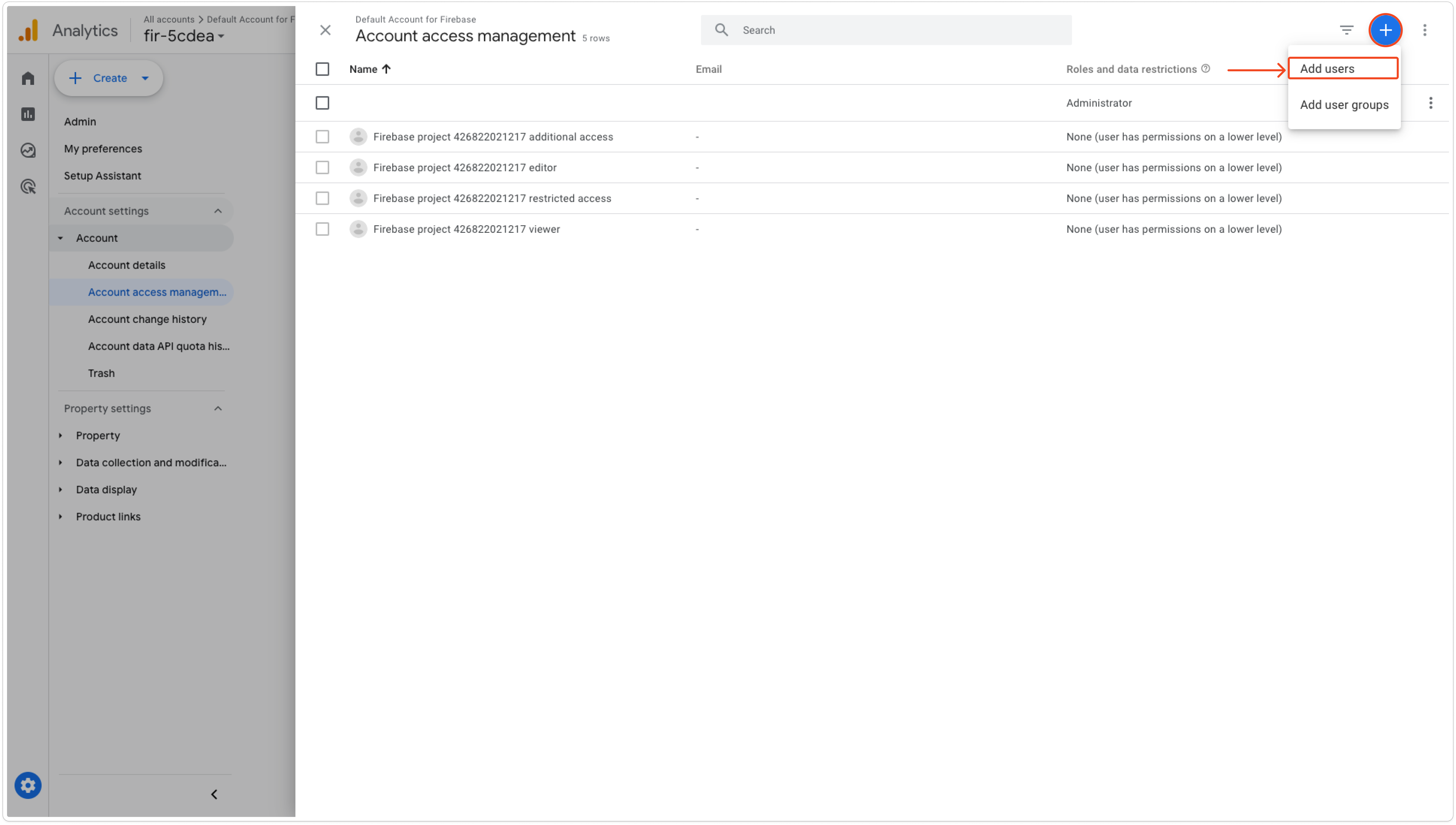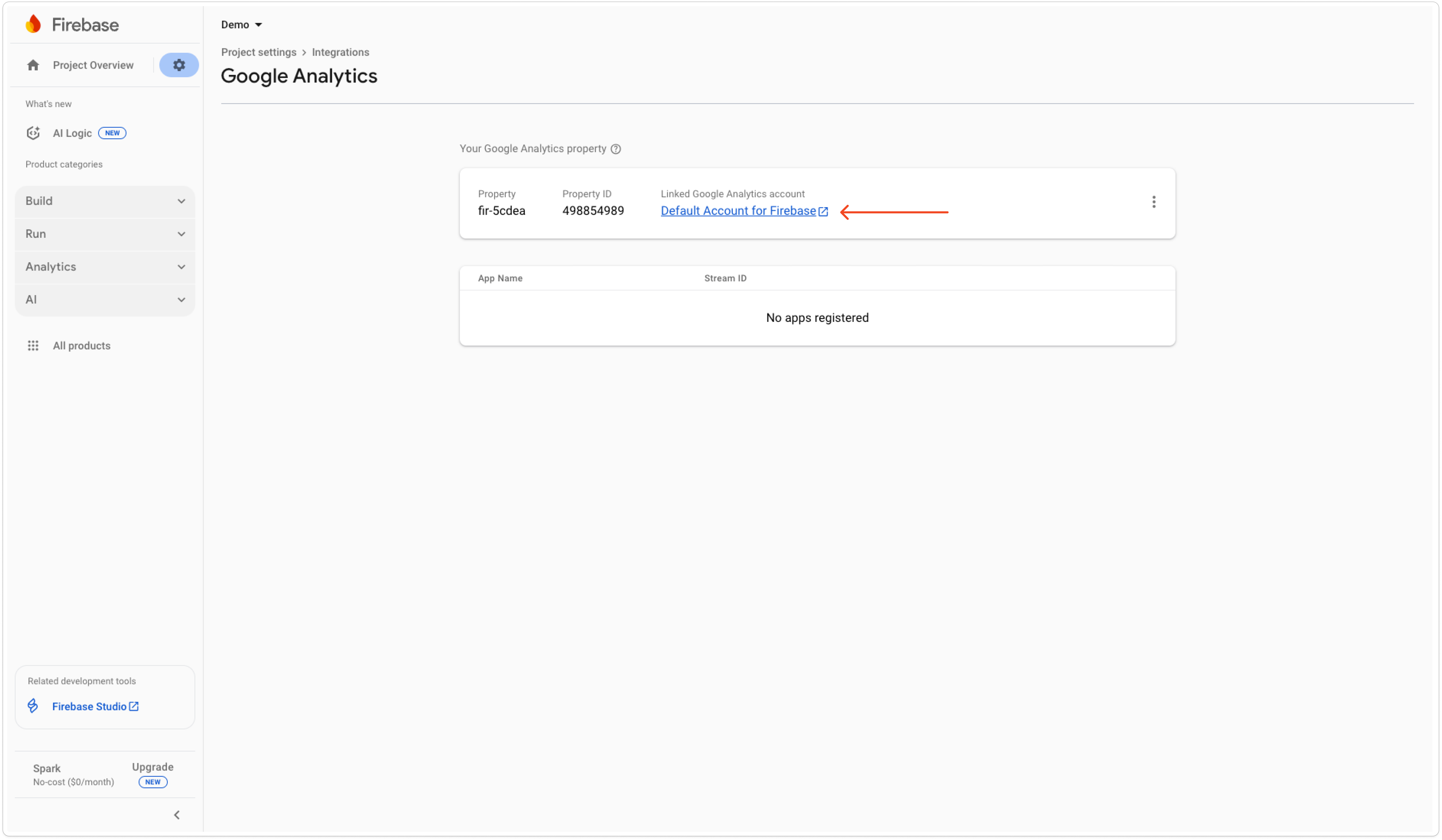 * Next, access the linked Google Analytics account. If you haven't created one before, don't worry, as it has already created a default one for you based on your Firebase project.