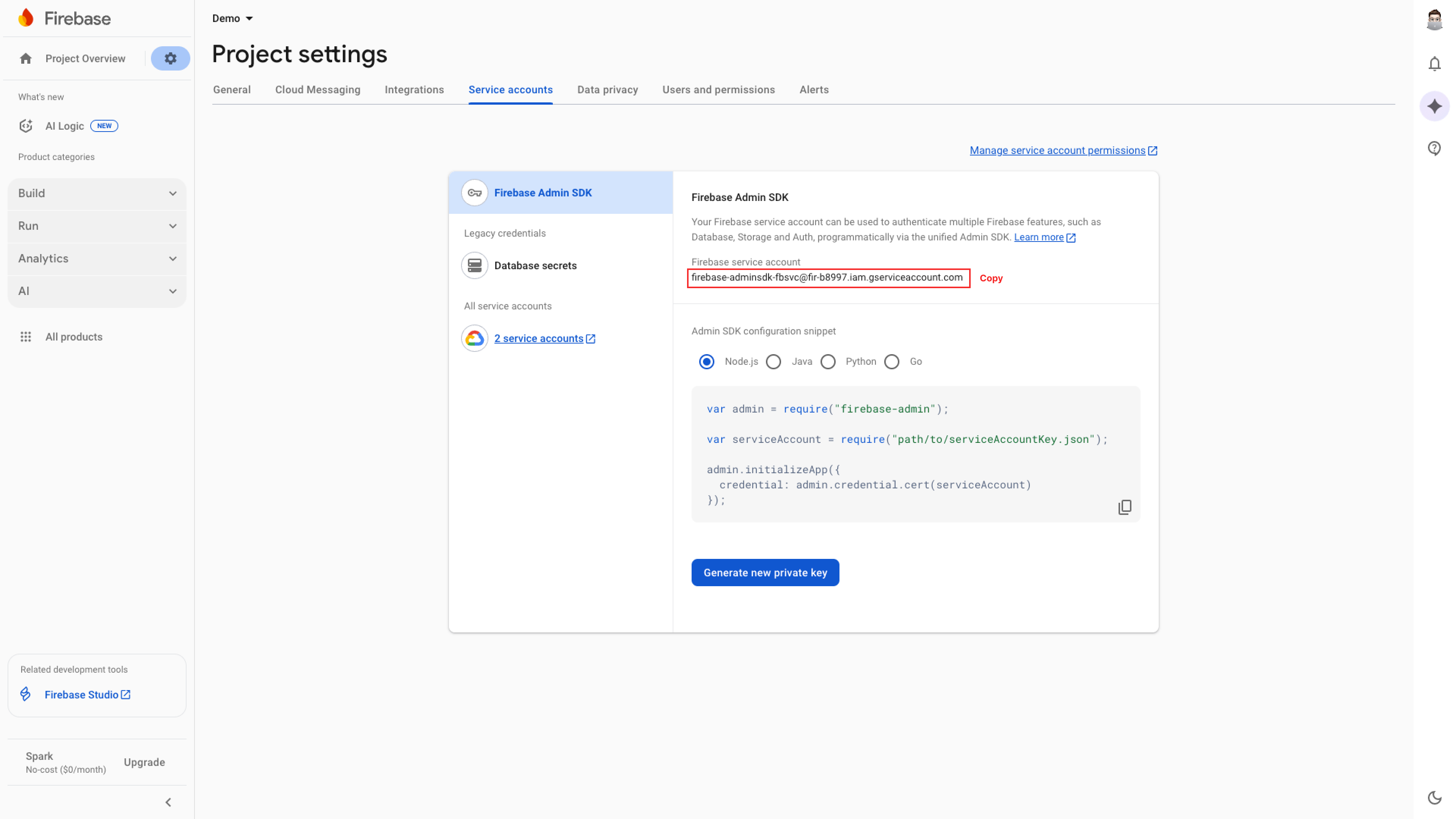 * Go to the **Service accounts tab** where you will find an email account. Please copy and save it for later.