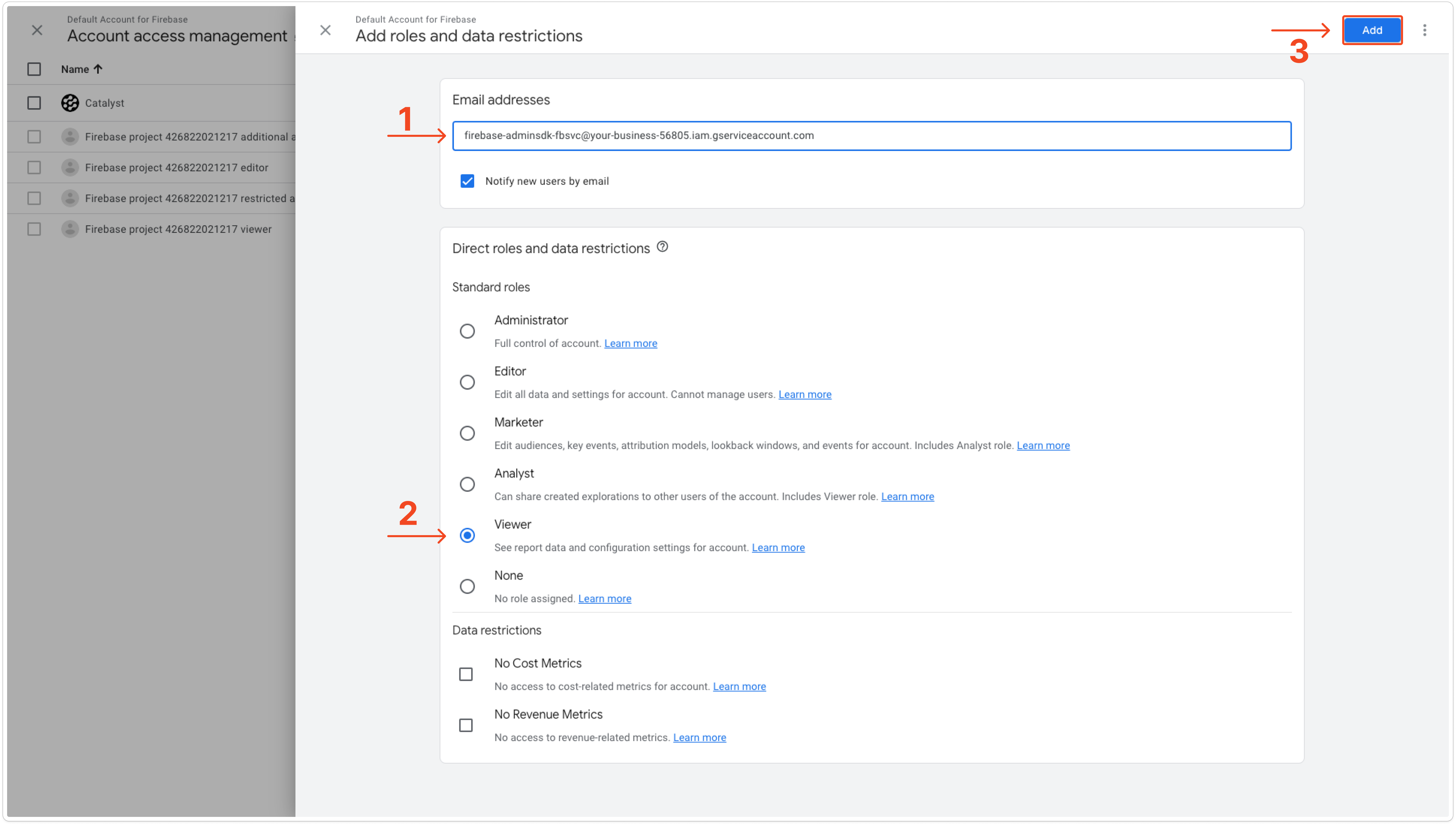 * Click the **+** icon to **Add user**. Then, **paste the email address** in the field with **Viewer permission.** Then, click **Add**.
