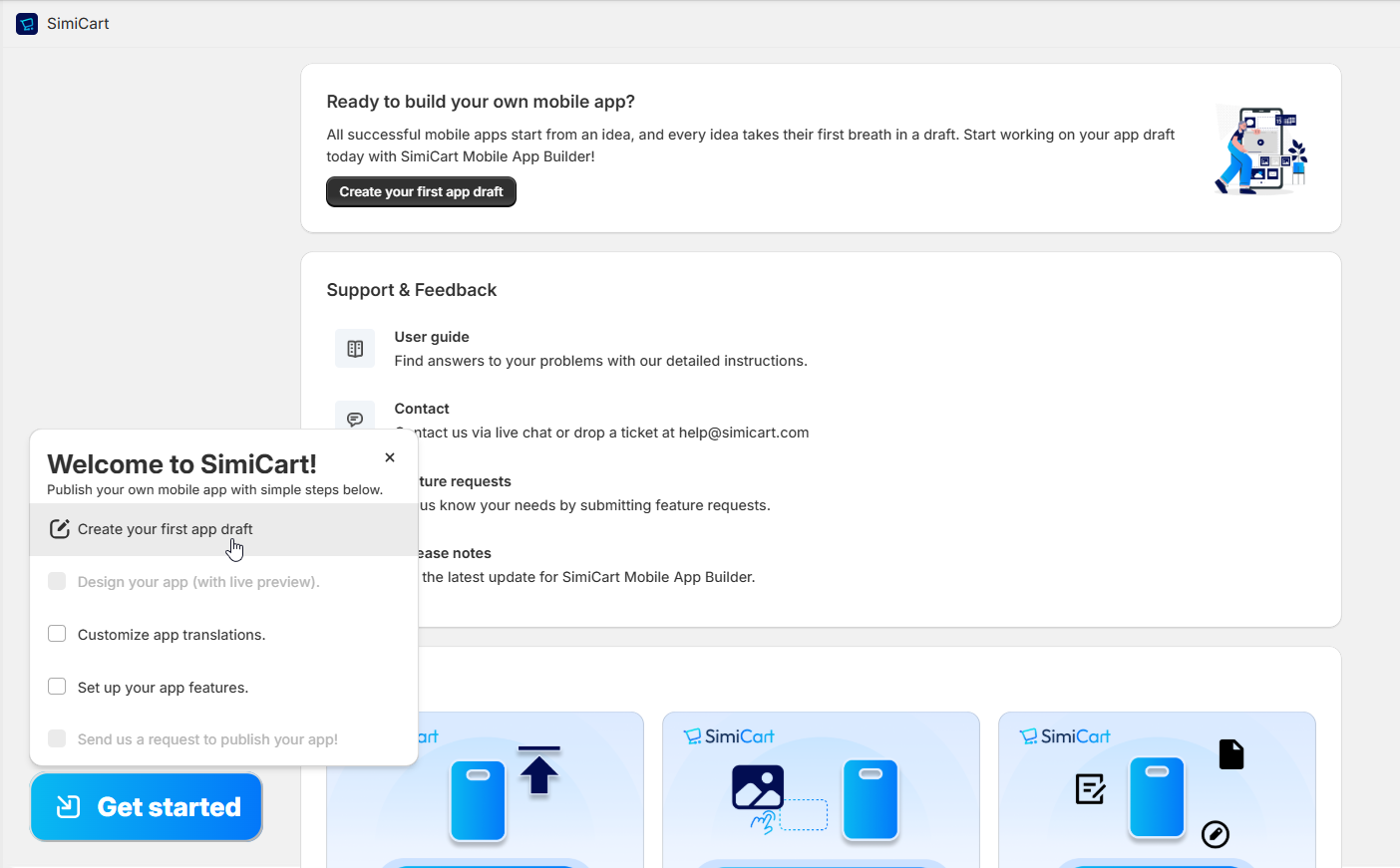 **Option 3:** Via our **Get Started** checklist, click "Create your first app draft" from . Please note that this option will not be available after you have created your first app draft.