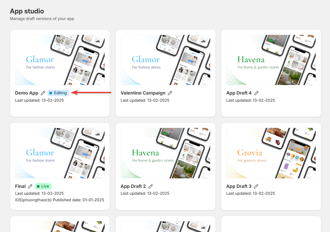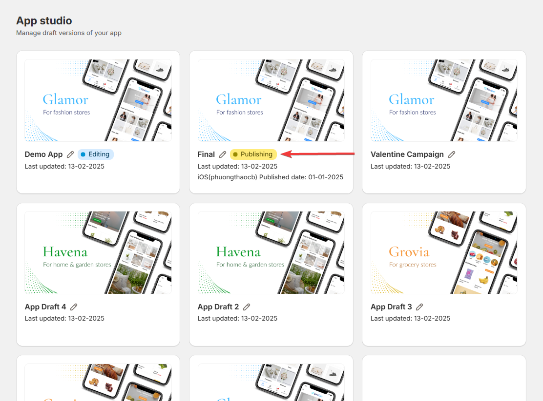 **Publishing:** This labels appears on app(s) that has been requested to publish on Apple App Store/Google Play Store. If you see this label on your app, please stay tuned as we bring your dream mobile app to reality within just 24-48 hours!