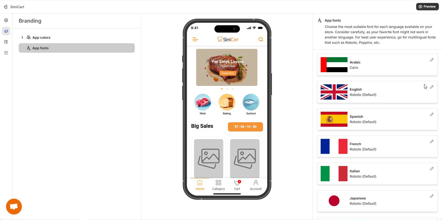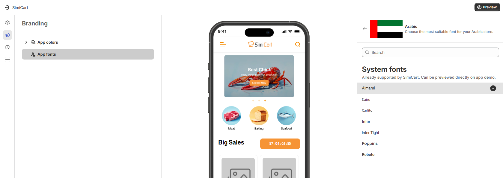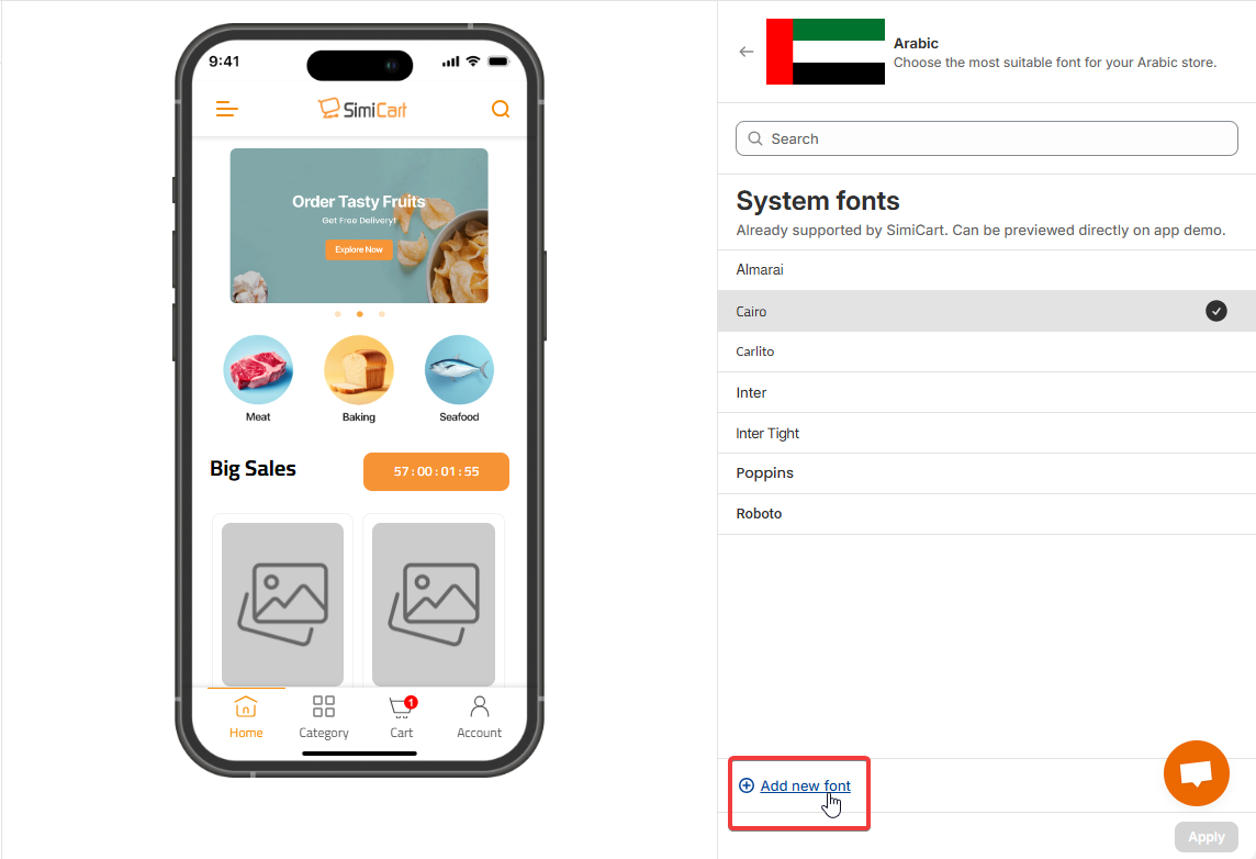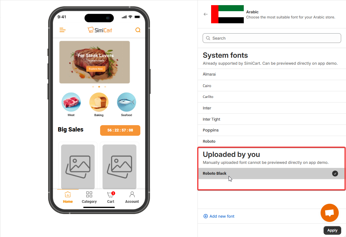 System fonts are fonts that are already supported by SimiCart. Once chosen, these fonts will be applied immediately in your demo app, or your live app.