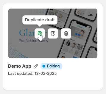 With each app draft, you can take up to 4 main actions: duplicate, edit, delete and rename. Hover on any app draft to see interactable icons for each action.