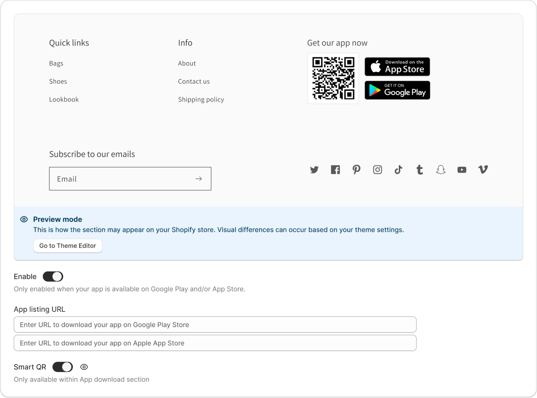 Enter your app store links and choose whether to display a Smart QR code for easy downloads.