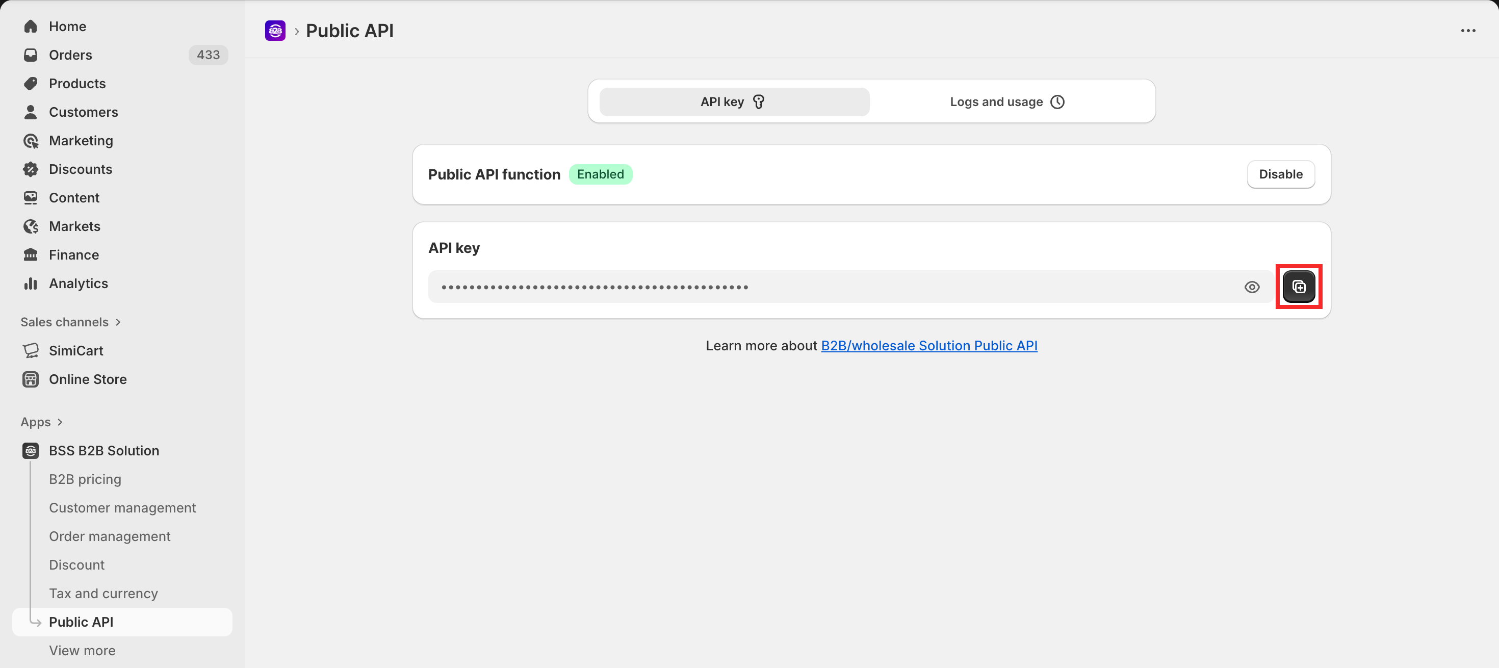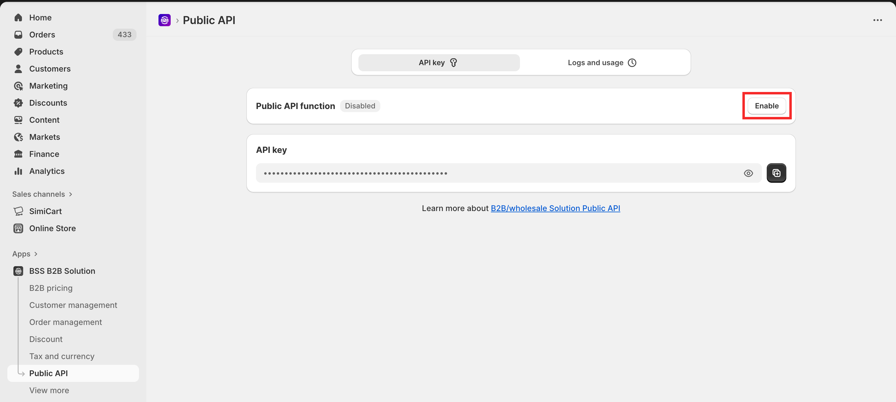 * From the BSS B2B Solution admin dashboard, navigate to **Public API**. Then, if necessary, click **Enable** to turn it on for potential connection with other applications.