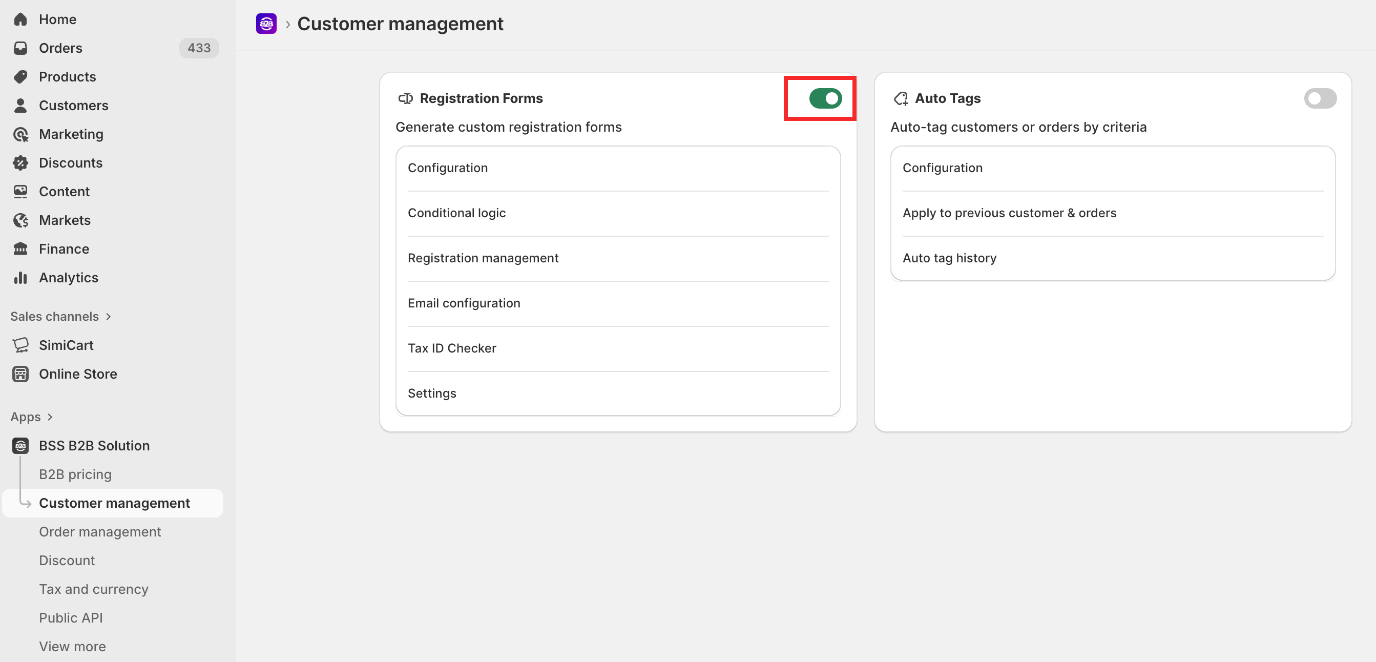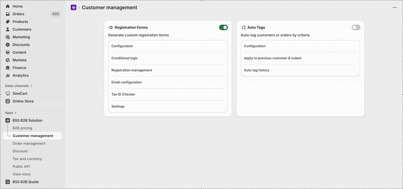 * You have installed the [<mark style="color:purple;">**BSS B2B & Wholesale Solution**</mark>](https://apps.shopify.com/b2b-solution-custom-pricing?search_id=82ee2a26-939a-48dd-b76f-855ca9d2f4d2\&surface_detail=b2b+solution\&surface_inter_position=1\&surface_intra_position=6\&surface_type=search) app on your Shopify store. Then, in the app: