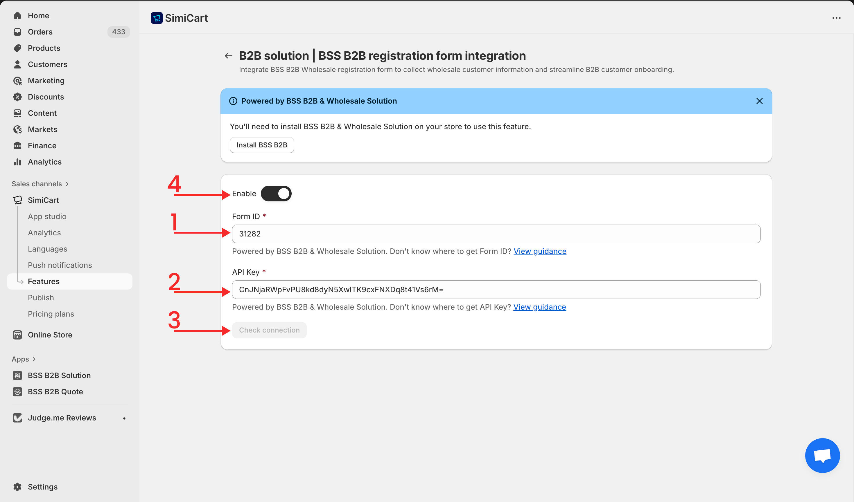 * Paste the **Form ID** and the **API key**. Then, click on **Check connection.** Once successful, toggle **Enable** to make it active.