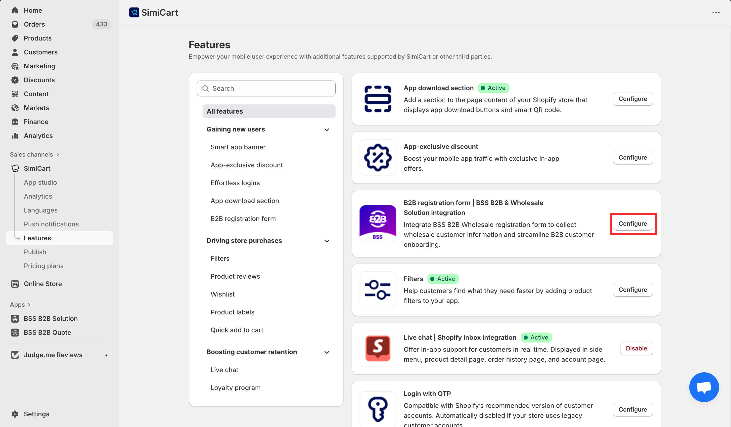 * Now, from the SimiCart Mobile App Builder admin dashboard, navigate to **Features** and find **B2B registration form | BSS B2B & Wholesale Solution integration.** Click **Configure.**