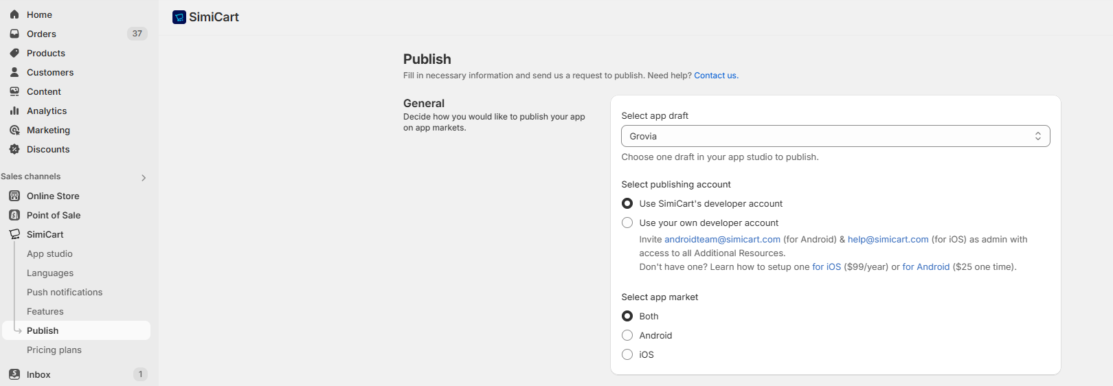 But even if you don't have one, need not worry! We highly recommend you to publish under SimiCart's developer account, as it is the most convenient and cost-effective option. In case you still prefer to publish under your own account, you can learn how to set up one [for iOS](https://developer.apple.com/support/app-account/) or [for Android](https://support.google.com/googleplay/android-developer/answer/6112435).